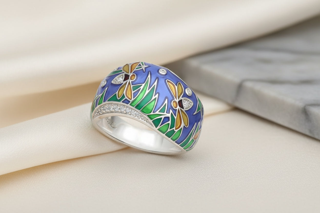 Capture the magic of a twilight garden with the Fireflies Ring, a mesmerizing expression of artistry and enchantment. This elegant domed ring reveals a whimsical dusk scene where delicate fireflies appear to dance beneath a twilight-blue sky. Hand-painted translucent Italian enamel creates a rich, luminous backdrop, while the fireflies’ gold-toned translucent enamel wings catch the light with every movement. Sparkling white accent stones adorn their bodies, softly echoing their natural glow.